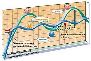 Благодаря инвертору срок службы климатической техники продлевается вдвое. Расходы на электроэнергию снижаются на 30 процентов. Благодаря наличию инвертора переменный ток преобразуется в постоянный. После этого ток приводится к необходимым характеристиками по силе тока и напряжению. Благодаря этому компрессор функционирует постоянно, обеспечивая оптимальную мощность для поддержания заданного микроклимата в помещении.